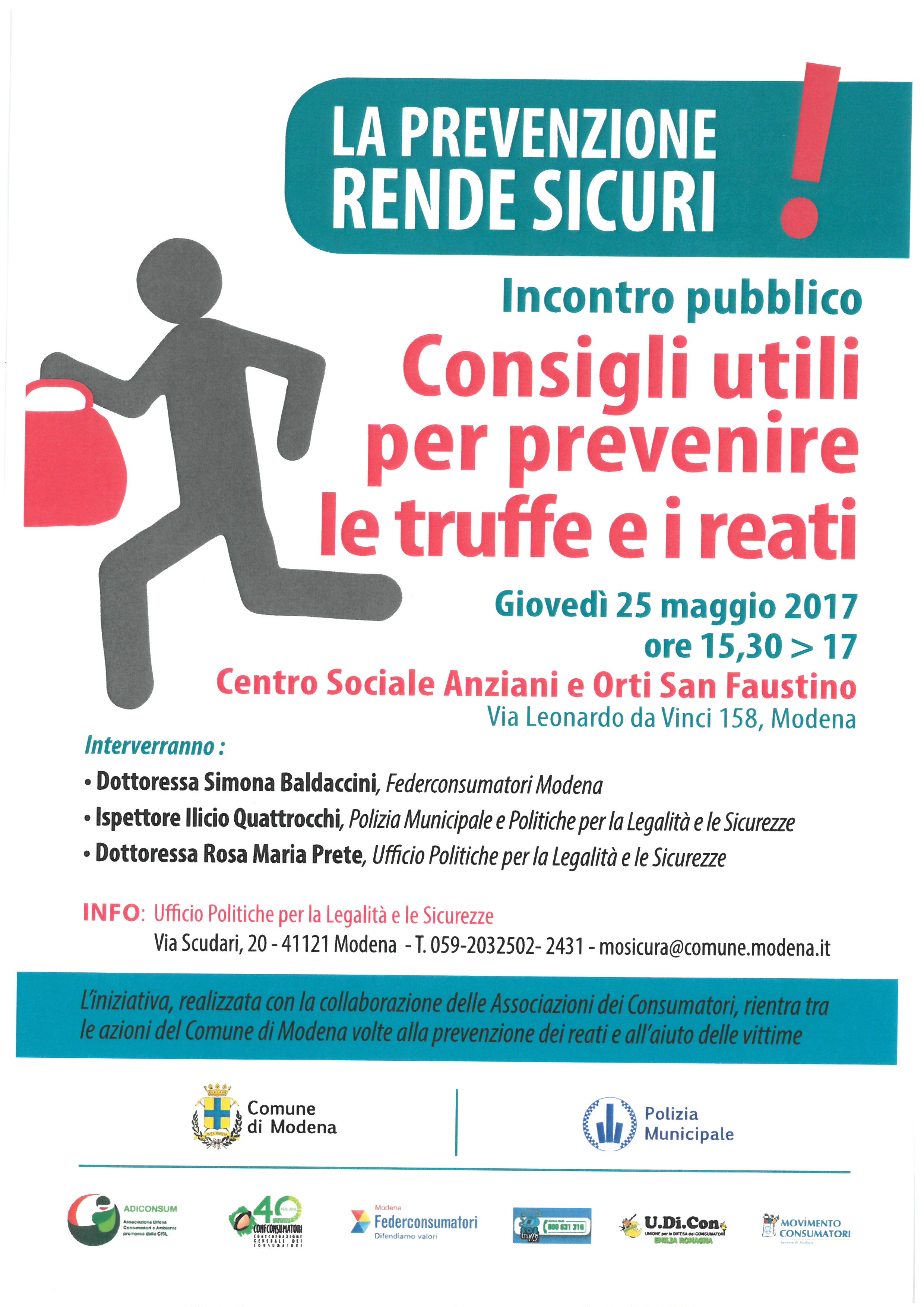 Federconsumatori Modena ricorda che Giovedì 25 Maggio 2017 alle 15:30, presso il Centro Sociale anziani e Orti S. Faustino di Modena, Via Leonardo da Vinci 158, si terrà un incontro aperto a tutta la cittadinanza sul tema “La prevenzione rende sicuri”, consigli utili per prevenire le truffe ed i reati.